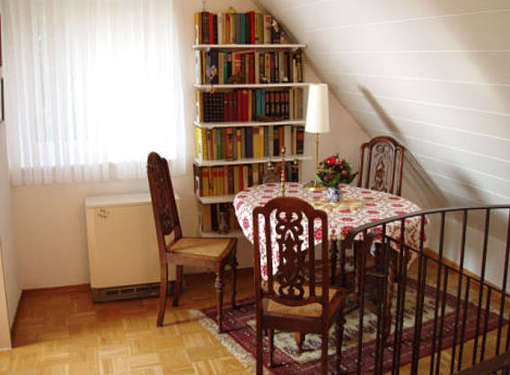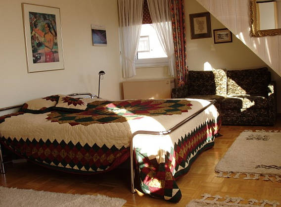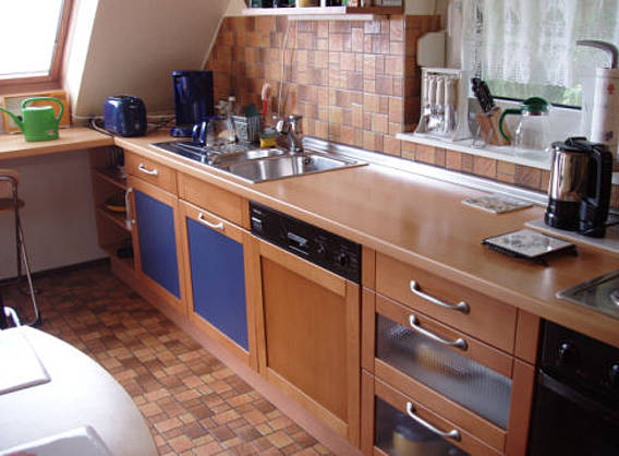 There are 115 sq. m. on two levels for 4 to max. 5 persons available. Two bedrooms, one with a double bed, one with a divan convertible for one or two persons. In addition, we have an extra single bed for a 5th person and a baby cot. This is rounded off by 2 bathrooms, one with a shower, one with a bathtub, each with washbasin and toilette. The kitchen is fully equipped with dishwasher and washing machine with an integrated dryer, electric stove and a microwave. Dishes, cutlery, pots and pans are available in sufficient numbers.